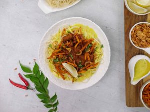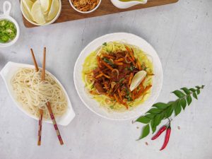 -In a serving plate,add spaghetti,prepared curry,beef currry,chips,fried garlic,fried onion,fresh coriander, lemon juice,chaat masala,lemon & serve!