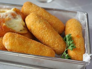 -Coat with all-purpose flour then dip into whisked eggs & coat with breadcrumbs then repeat same coating (makes 8-10 fingers).