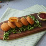Take a mixture (10g) and make a ball,grease hands with oil,take a chicken mixture (1 tbs) and flatten on your palm,place cheese ball and cover properly with chicken mixture.