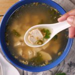 -Take out chicken pieces,shred the chicken from bones & cut fillet into thin pieces then strain the soup & set aside.
