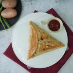 Tortilla ya roti ka upper aloo& chicken filling dal ker triangle shape mein pheela lein.