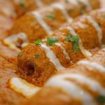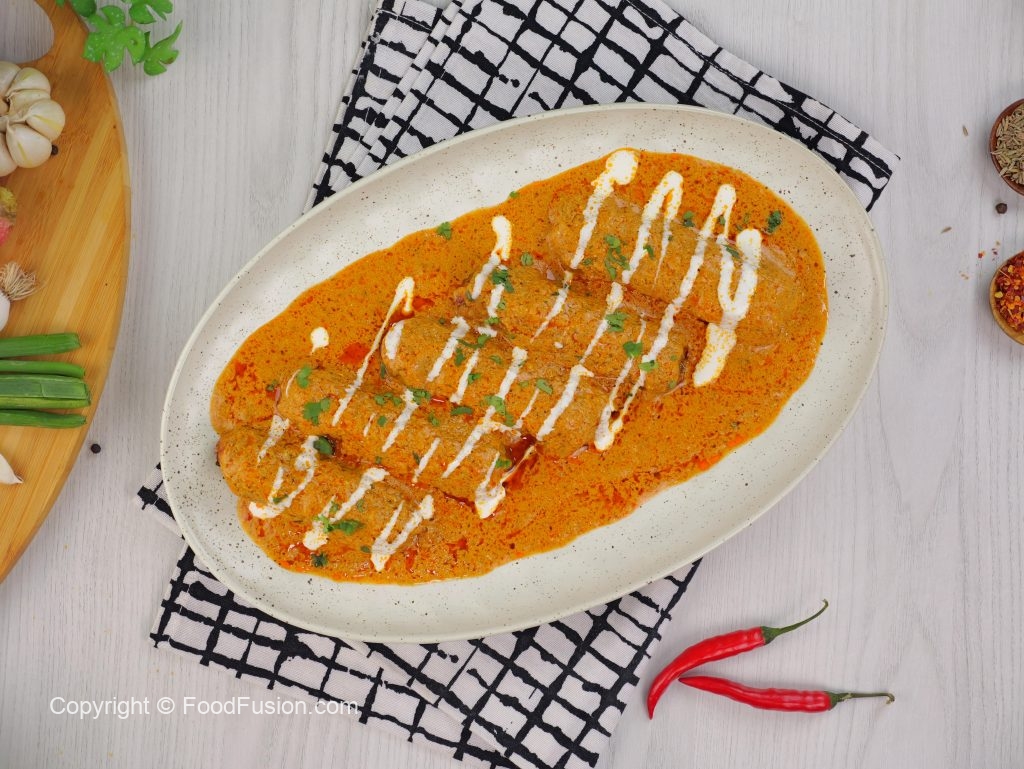 -In a serving platter add vegetable seekh kabab, pour gravy over kabab, garnish with cream & fresh coriander, serve with naan!