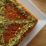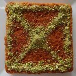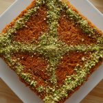 After baking,pour generously warm sugar syrup and garnish with pistachios.